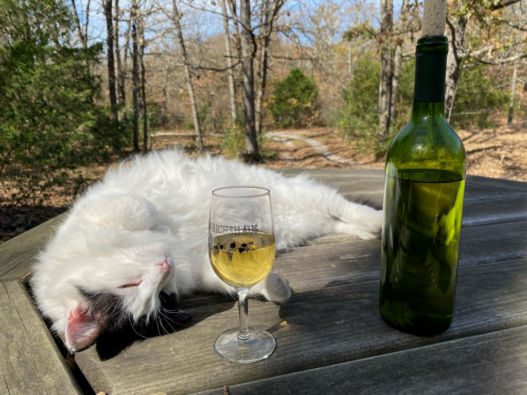 After our tasting we settled on a bottle of the Vignoles and sat out on the patio and enjoyed a glass of wine while being kept company by Jeffery the cat.